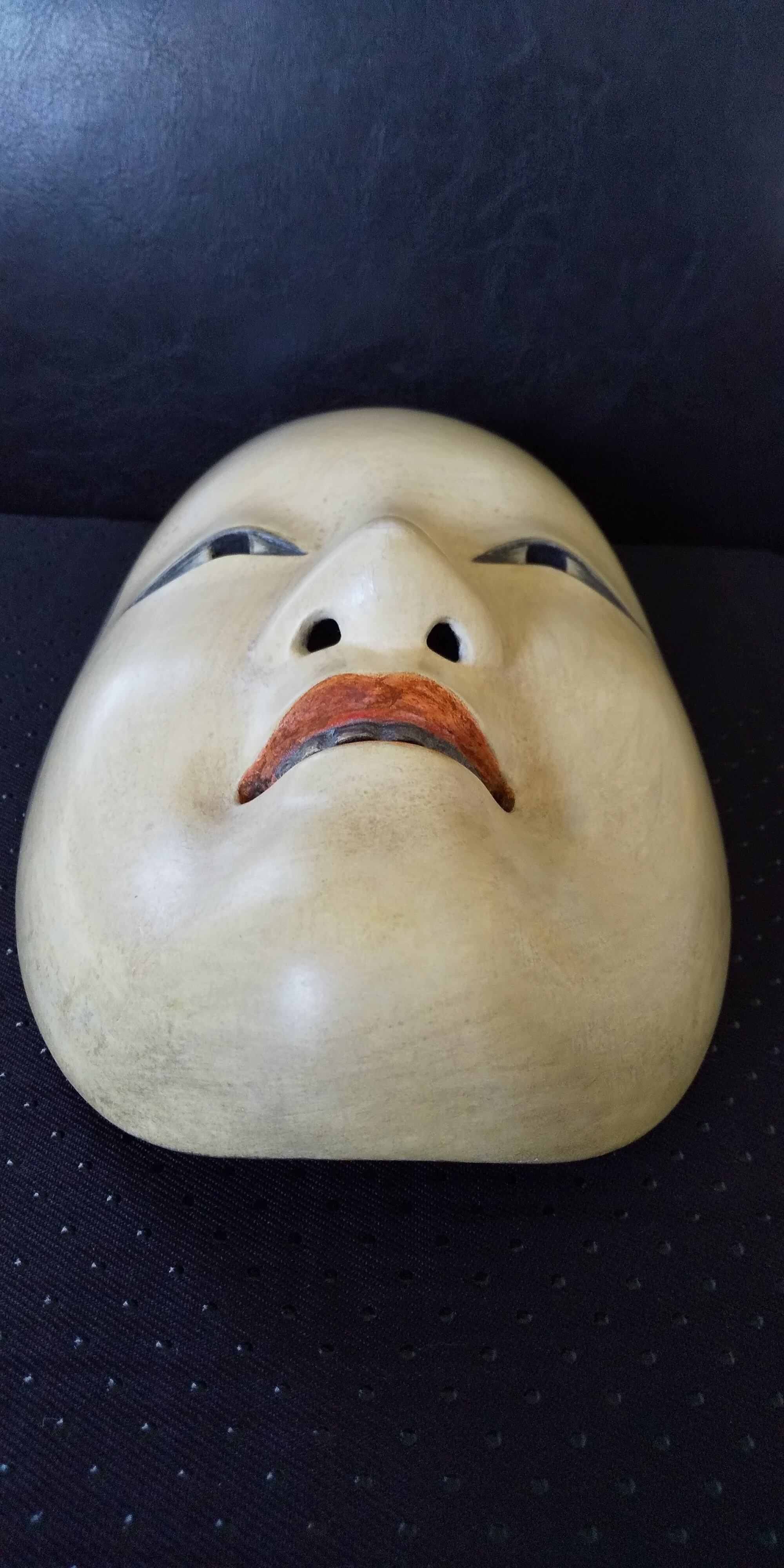 材木曾檜、寸法縦213mm横135mm高さ64mm、胡粉と水干絵具の本格彩色、作者は能面師菅原法房が彫刻し、山口義法が彩色した1995年の合作。桐箱に法房の箱書、面裏に義法の焼印がある。面袋付き。宅配送料込み。